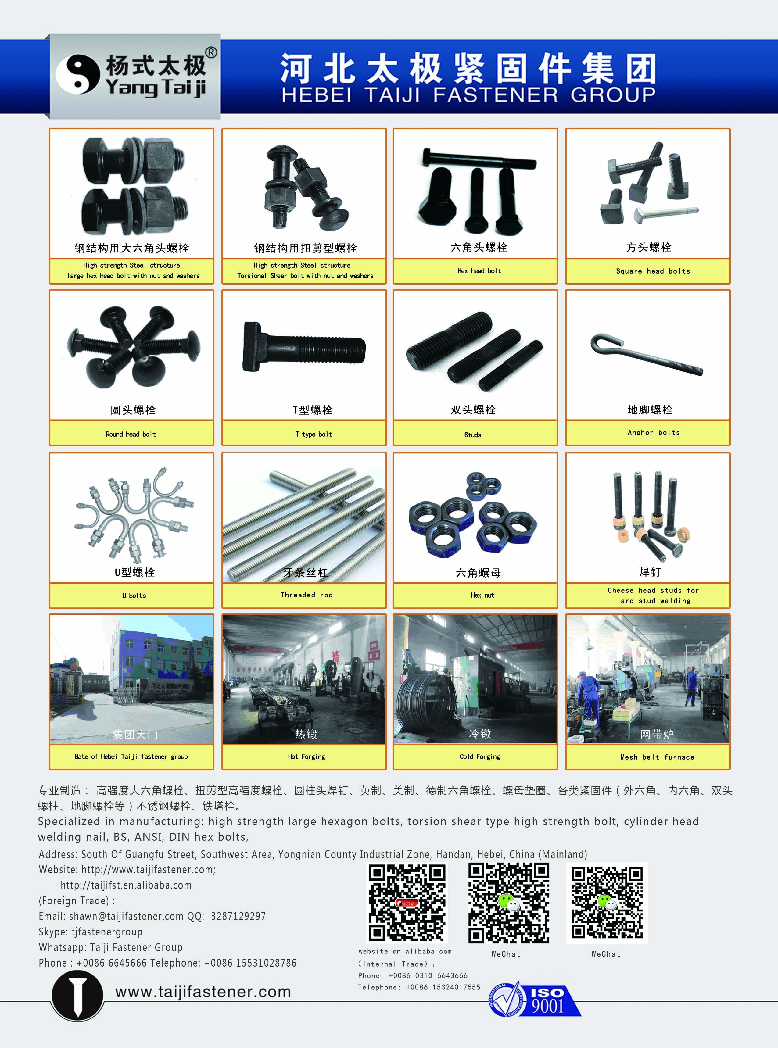 河北太極緊固件集團有限公司是鋼結構用高強度大六角頭螺栓、鋼結構用扭剪型高強度螺栓連接副、軌道交通螺栓(四方頭、半圓頭螺栓)、圓柱頭焊釘、雙頭螺栓(化工、石油螺栓A193-B7等等)、鋼軌用高強度魚尾螺栓、六角螺栓等產品專業(yè)生產的有限責任公司,公司總部設在邯鄲,河北太極高強度標準件有限公司擁有完整、科學的質量管理體系。河北太極高強度標準件有限公司的誠信、實力和產品質量獲得業(yè)界的認可。歡迎各界朋友蒞臨河北太極高強度標準件有限公司參觀、指導和業(yè)務洽談。 河北太極高強度標準件有限公司始建于1996年,廠區(qū)占地面積35000多平方米,擁有各類自動化生產及檢測設備300余臺套,采用進口及國內大型鋼廠優(yōu)質原材料,以現代化企業(yè)制度為運營機制,嚴格按照ISO9001:2008質量體系進行管理。公司旗下楊氏太極品牌是專業(yè)制造鋼結構用大六角高強度螺栓連接副、鋼結構用扭剪型高強度螺栓連接副、鋼結構球節(jié)點用鋼網架螺栓、焊釘、地腳螺栓、國內外標準各類高強度緊固件。經北京機械工業(yè)通用零部件產品質量監(jiān)督檢測中心,天津市建筑工程質量檢測中心,山東大學材料力學實驗室等權威部門檢測結果,全部合格。產品廣泛用于航天,建筑,交通,電力,軍工等行業(yè),并進入多個國家重點建設項目工程--奧運中心體育場,深圳機場,三峽工程,北京植物園,北京地鐵5號線,上海松江經濟開發(fā)區(qū)重大項目,南京長江三橋,武漢長江二橋等。